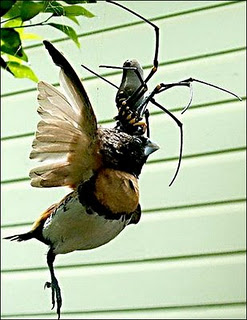 I am rather a bit creeped out by these GIANT effing SPIDERS! Especially since the thing is eating a bird, and not a little tiny one, either. A big freakin’ bird. Being eaten by an even larger SPIDER!